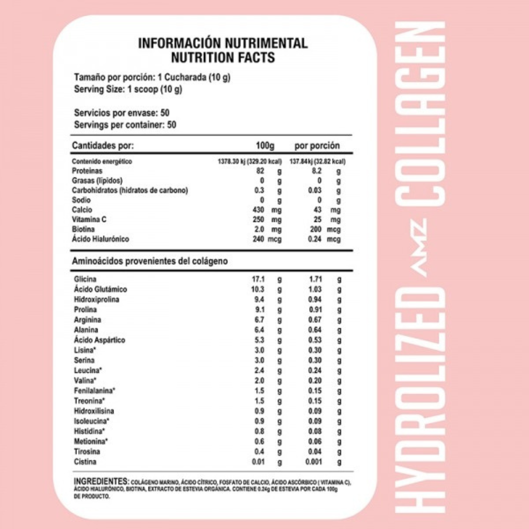 AMZ HYDROLIZED COLLAGEN es colágeno 100% puro de origen marino hidrolizado, diseñado para combinar salud y belleza en un solo suplemento. Con 8.2g de proteína por porción y enriquecido con Vitamina C, Biotina, Ácido Hialurónico y Calcio, es la solución completa para mantener tu piel, cabello y uñas radiantes mientras cuidas tu bienestar integral.